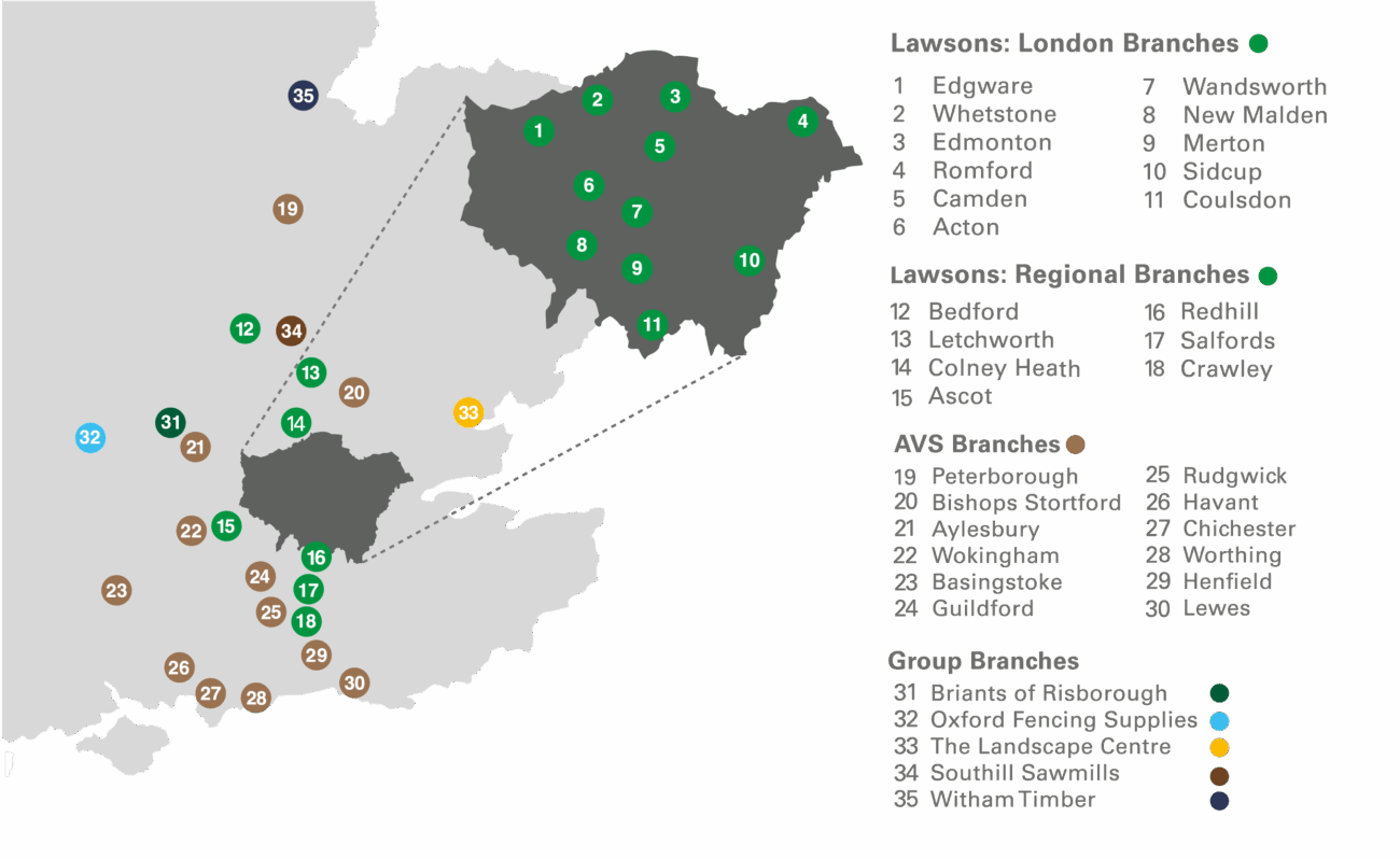 With over 700 employees and a turnover in excess of £175 million, the Group includes 18 Lawsons branches and 13 branches of AVS Fencing & Landscaping Supplies, in addition to Basingstoke Building Supplies, Briants of Risborough, Southill Sawmills, The Landscape Centre, Oxford Fencing Supplies and Witham Timber. With continued expansion and acquisitions our business is continuing to grow across the United Kingdom.